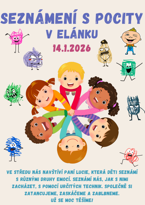 Ve středu 14.1.2026 nás navštíví paní Lucie, která děti seznámí s různými druhy emocí. Seznámí nás, jak s nimi zacházet, s pomocí určitých technik. Společně si zatancujeme, zaskáčeme a zablbneme.