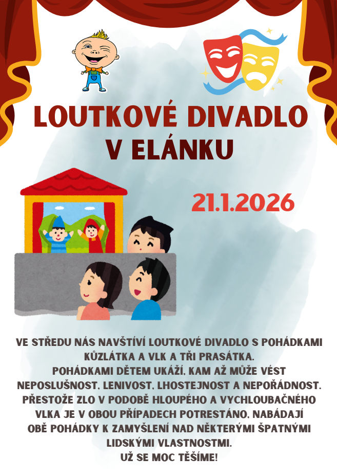 Ve středu 21.1.2026 nás navštíví loutkové divadlo s pohádkami Kůzlátka a Vlk a Tři prasátka.