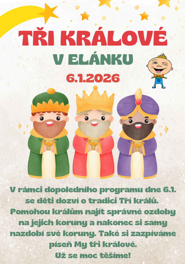 V rámci dopoledního programu dne 6.1. se děti dozví o tradici Tří králů. Pomohou králům najít správné ozdoby na jejich koruny a nakonec si samy nazdobí své koruny. Také si zazpíváme píseň My tři králové.