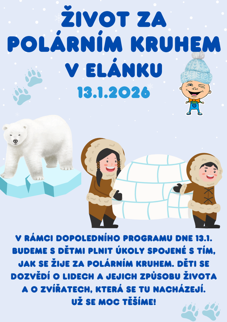 V rámci dopoledního programu dne 13.1. budeme s dětmi plnit úkoly spojené s tím, jak se žije za polárním kruhem. Děti se dozvědí o lidech a jejich způsobu života a o zvířatech, která se tu nacházejí.