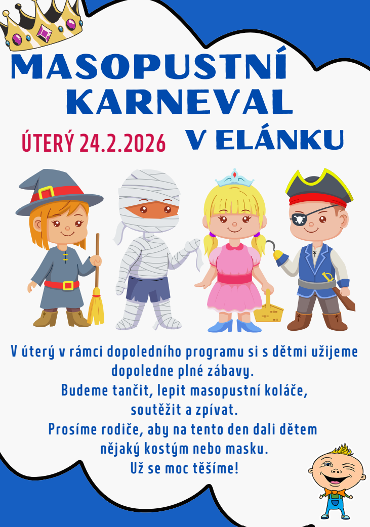 V rámci dopoledního programu dne 24.2. si s dětmi užijeme dopoledne plné zábavy. Budeme tančit, lepit masopustní koláče, soutěžit a zpívat. Prosíme rodiče, aby na tento den dali dětem nějaký kostým nebo masku.