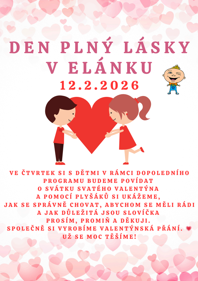 Ve čtvrtek 12.2.2026 si s dětmi v rámci dopoledního programu budeme povídat o svátku svatého Valentýna a pomocí plyšáků si ukážeme, jak se správně chovat, abychom se měli rádi a jak důležitá jsou slovíčka prosím, promiň a děkuji.