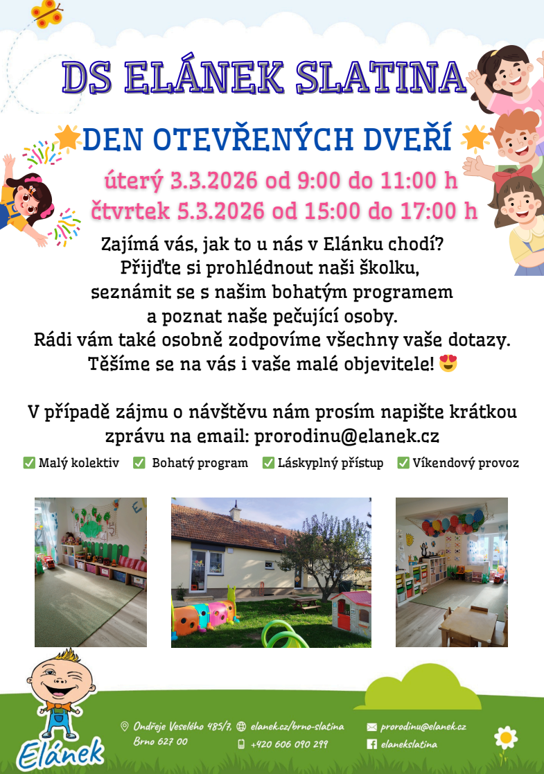 Kde: Dětská skupina Elánek Slatina, Ondřeje Veselého 7, Brno-Slatina