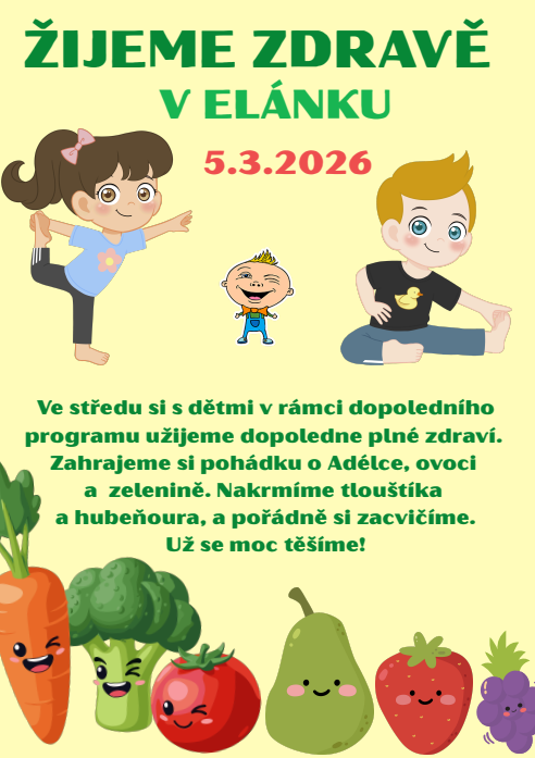 Ve středu 11.3.2026 si s dětmi v rámci dopoledního programu užijeme dopoledne plné zdraví. Zahrajeme si pohádku o Adélce, ovoci a zelenině. Nakrmíme tlouštíka a hubeňoura, a pořádně si zacvičíme.