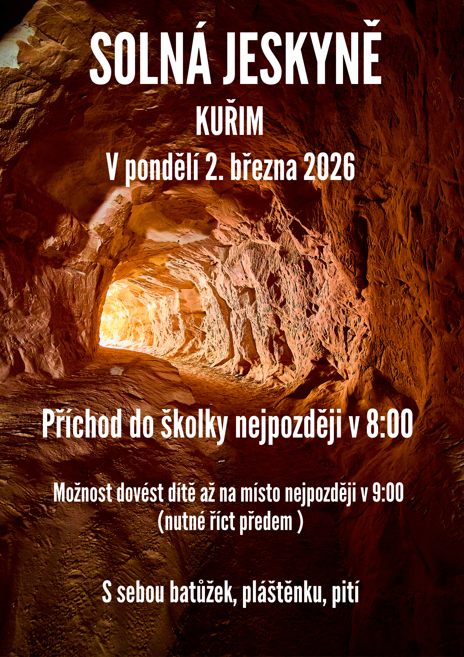 V pondělí 2. března 2026 pojedeme do solné jeskyně. Prosíme o příchod do školky nejpozději do 8:00 hodin.