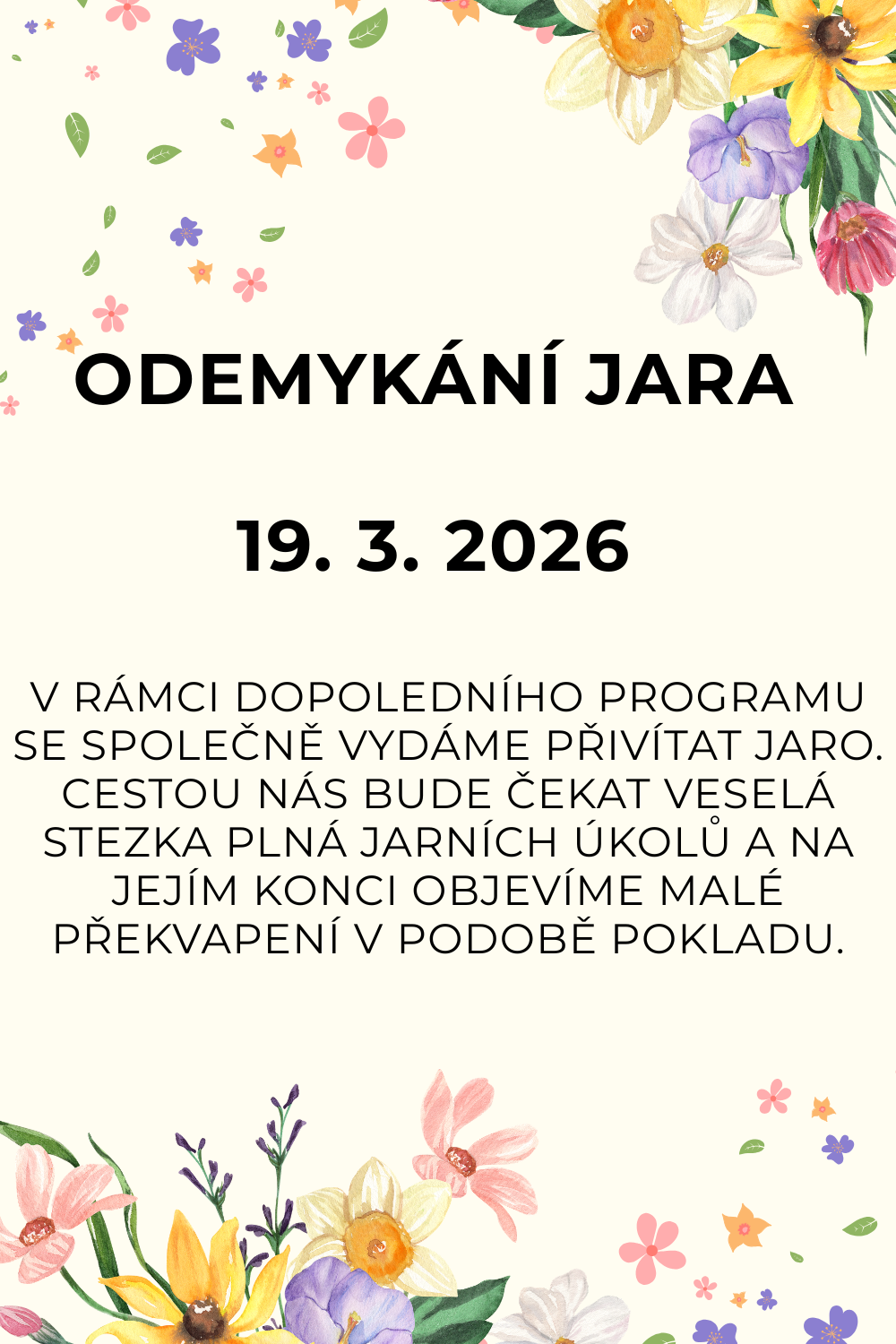 Čeká nás veselá jarní stezka plná úkolů, kde děti splní malé výzvy. Na konci cesty na ně bude čekat zasloužený poklad.