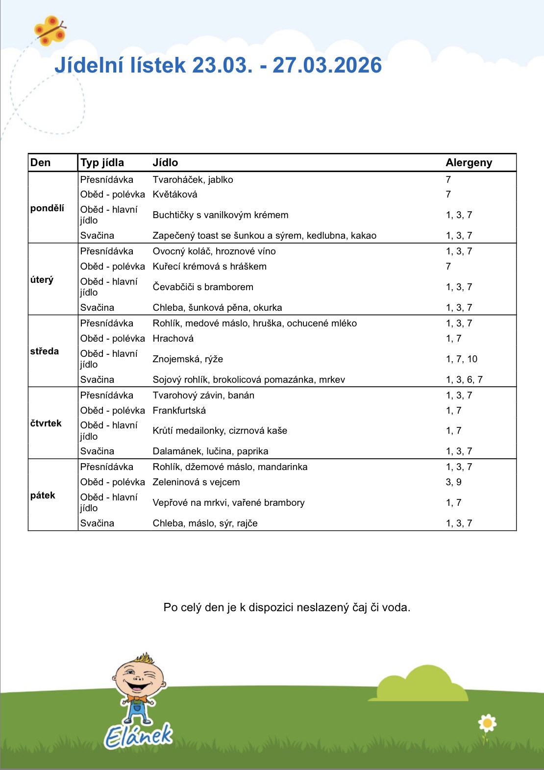 Stravné – dopolední přesnídávka, ovoce, oběd, odpolední svačina, zelenina, pitný režim po celou dobu pobytu.