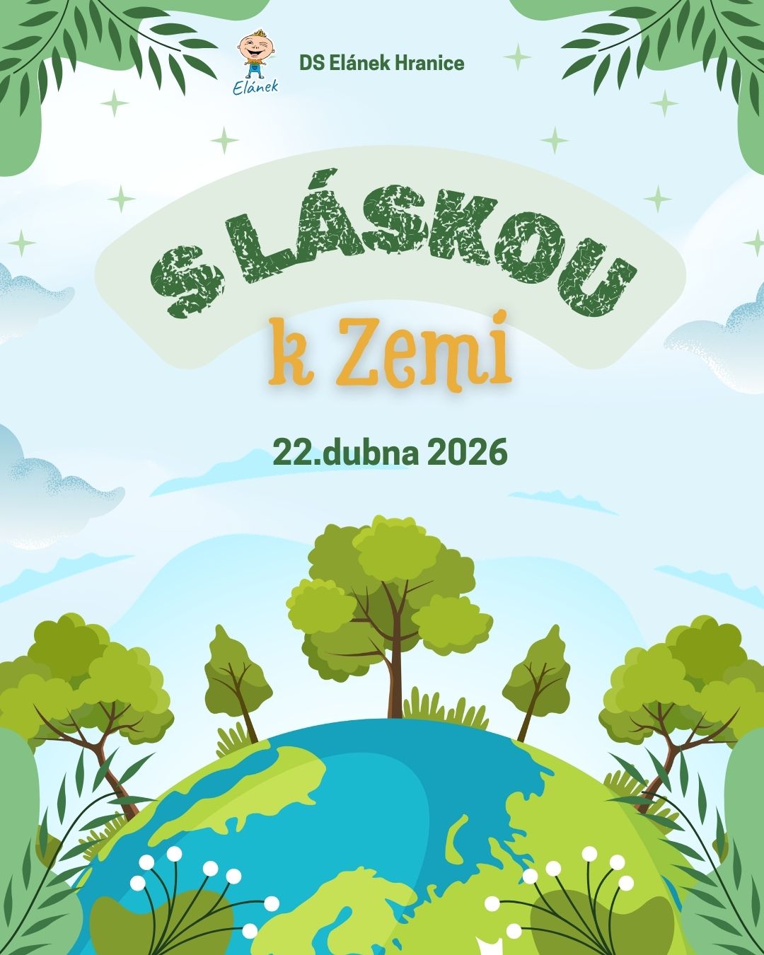 U příležitosti Dne Země si s dětmi ve středu 22.dubna 2026 připomeneme, jak důležité je chránit naši planetu a pečovat o přírodu kolem nás. Děti čekají hravé a poučné aktivity venku zaměřené na ekologii – povídání o třídění odpadu, ochranu přírody, jednoduché hry i tvoření s přírodní tematikou. Společně si ukážeme, jak může každý z nás přispět k tomu, aby byla naše Země čistá a zdravá - čištění přírody v okolí.
