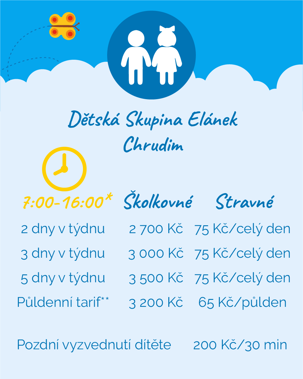 - pozdní vyzvednutí - v případě, že bez předchozí domluvy si rodič dítě nevyzvedne včas po skončení zvoleného tarifu