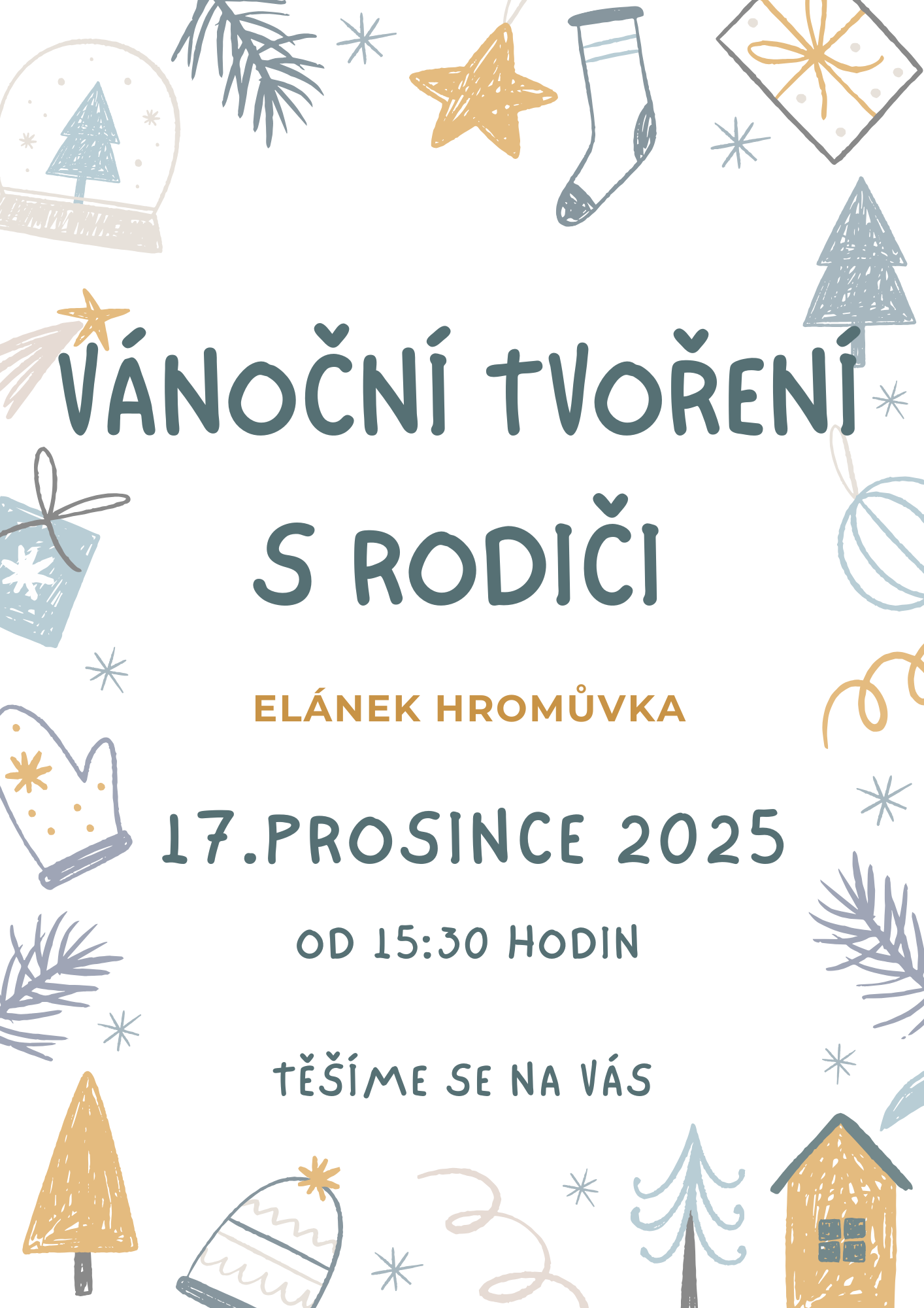 Srdečně Vás zveme na vánoční tvoření s rodiči, které se bude konat 17.prosince 2025 od 15:30 u nás v Elánku. Užijeme si příjemnou atmosféru a naladíme se na přicházející svátky.