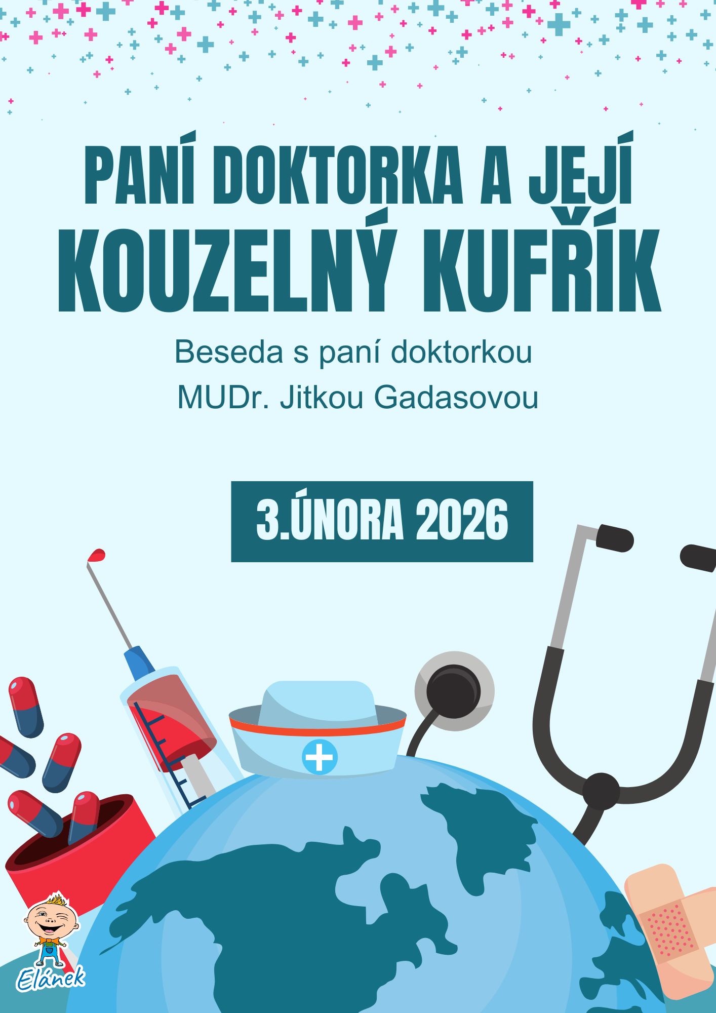 Dne 3.února 2026 nás navštíví dětská lékařka MUDr. Gadasová a ukáže nám, jaké nástroje používá, k čemu slouží a seznámí nás s její prací.