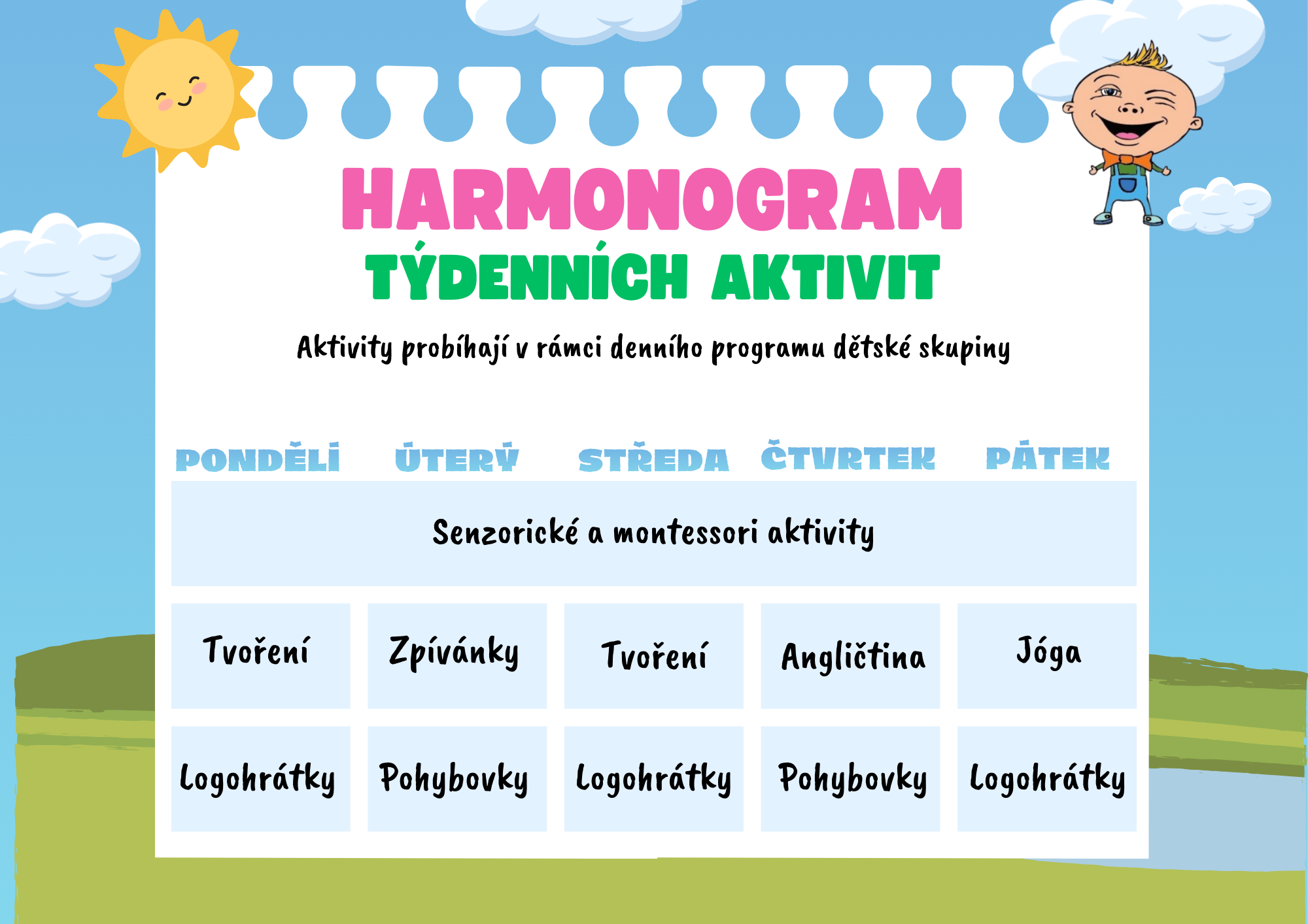 Docházka: 5 dnů v týdnu (lze chodit nepravidelně, docházku si rodiče volí v našem školkovém systému Elis)