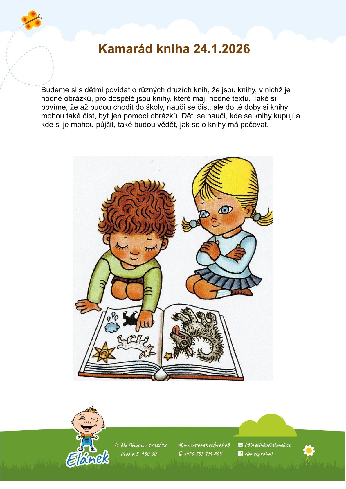 Budeme si s dětmi povídat o různých druzích knih, že jsou knihy, v nichž je hodně obrázků, pro dospělé jsou knihy, které mají hodně textu. Také si povíme, že až budou chodit do školy, naučí se číst, ale do té doby si knihy mohou také číst, byť jen pomocí obrázků. Děti se naučí, kde se knihy kupují a kde si je mohou půjčit, také budou vědět, jak se o knihy má pečovat.