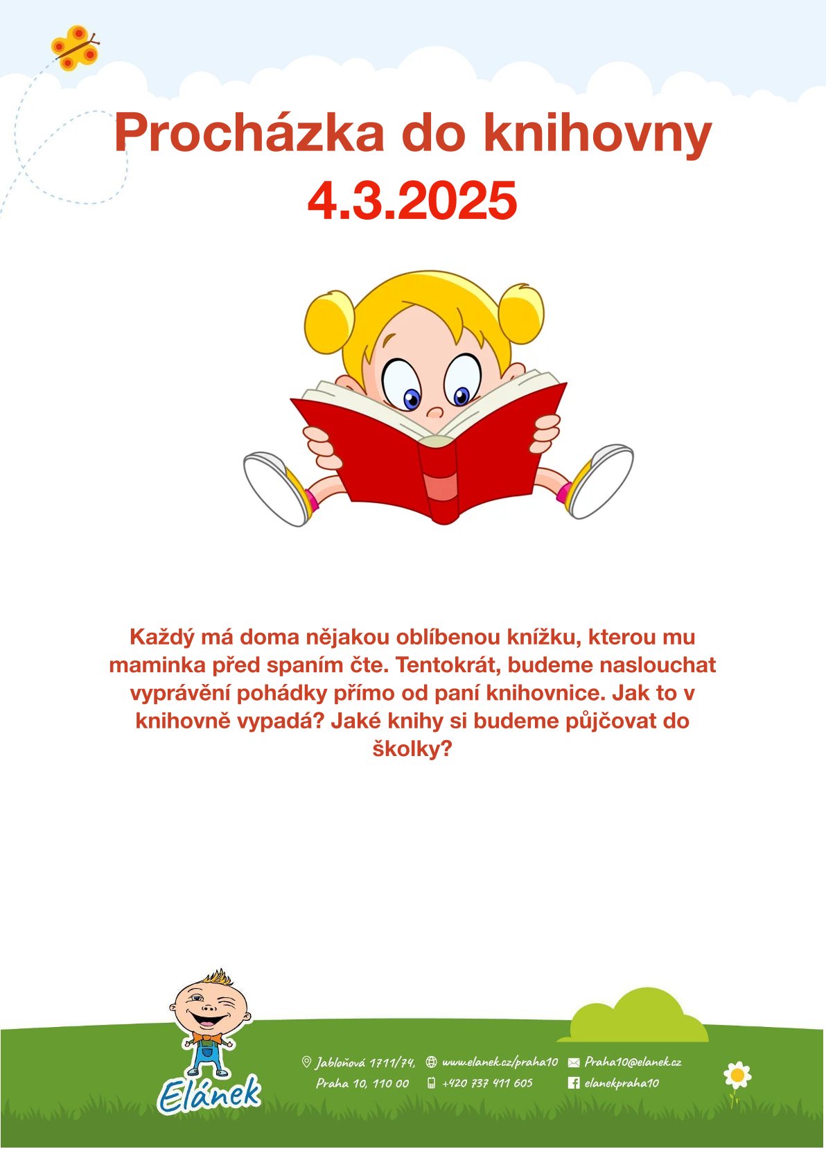 Každý má doma nějakou oblíbenou knížku, kterou mu maminka před spaním čte. Tentokrát, budeme naslouchat vyprávění pohádky přímo od paní knihovnice. Jak to v knihovně vypadá? Jaké knihy si budeme půjčovat do školky?