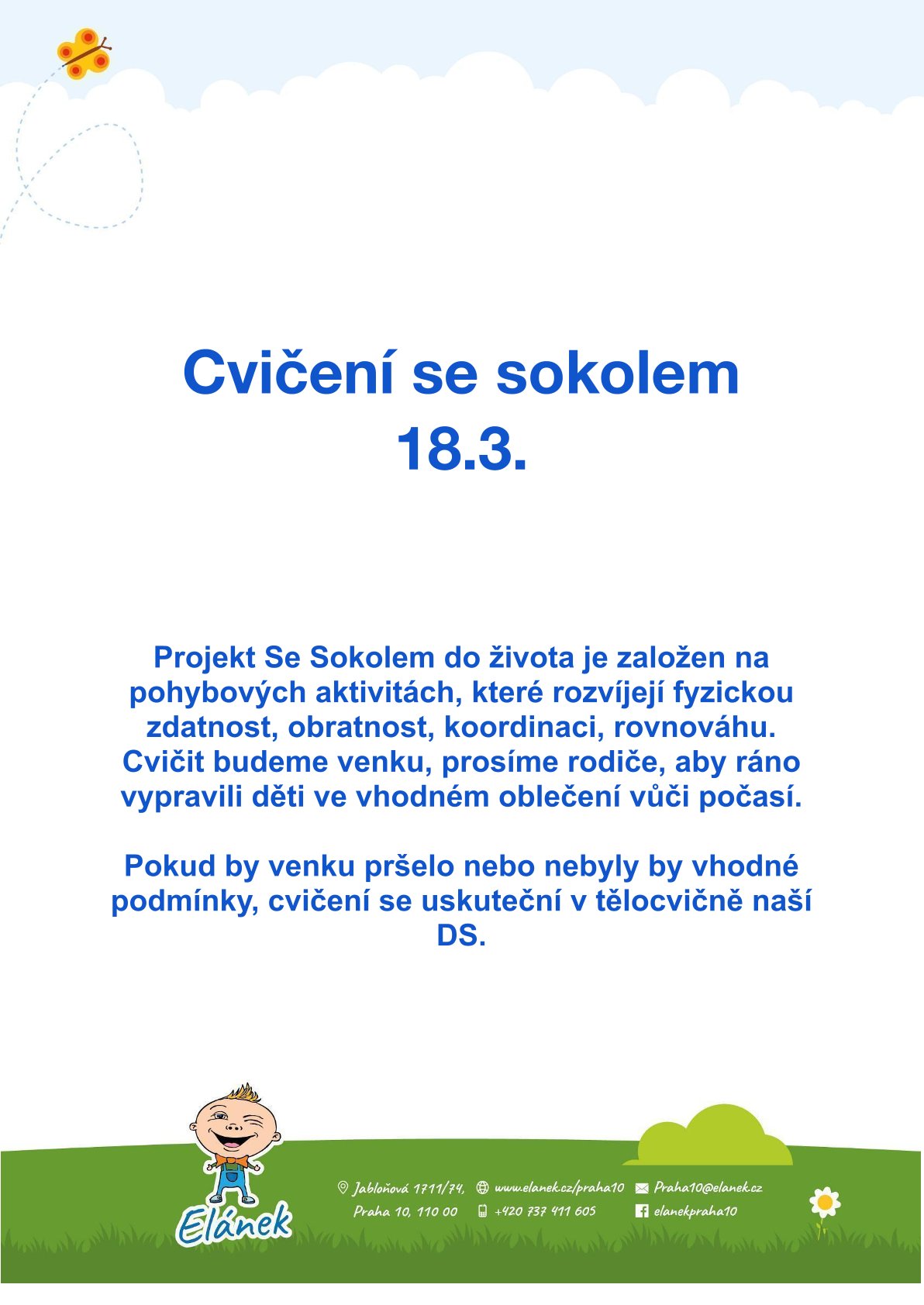 Cvičit budeme venku, prosíme rodiče, aby ráno vypravili děti ve vhodném oblečení vůči počasí.